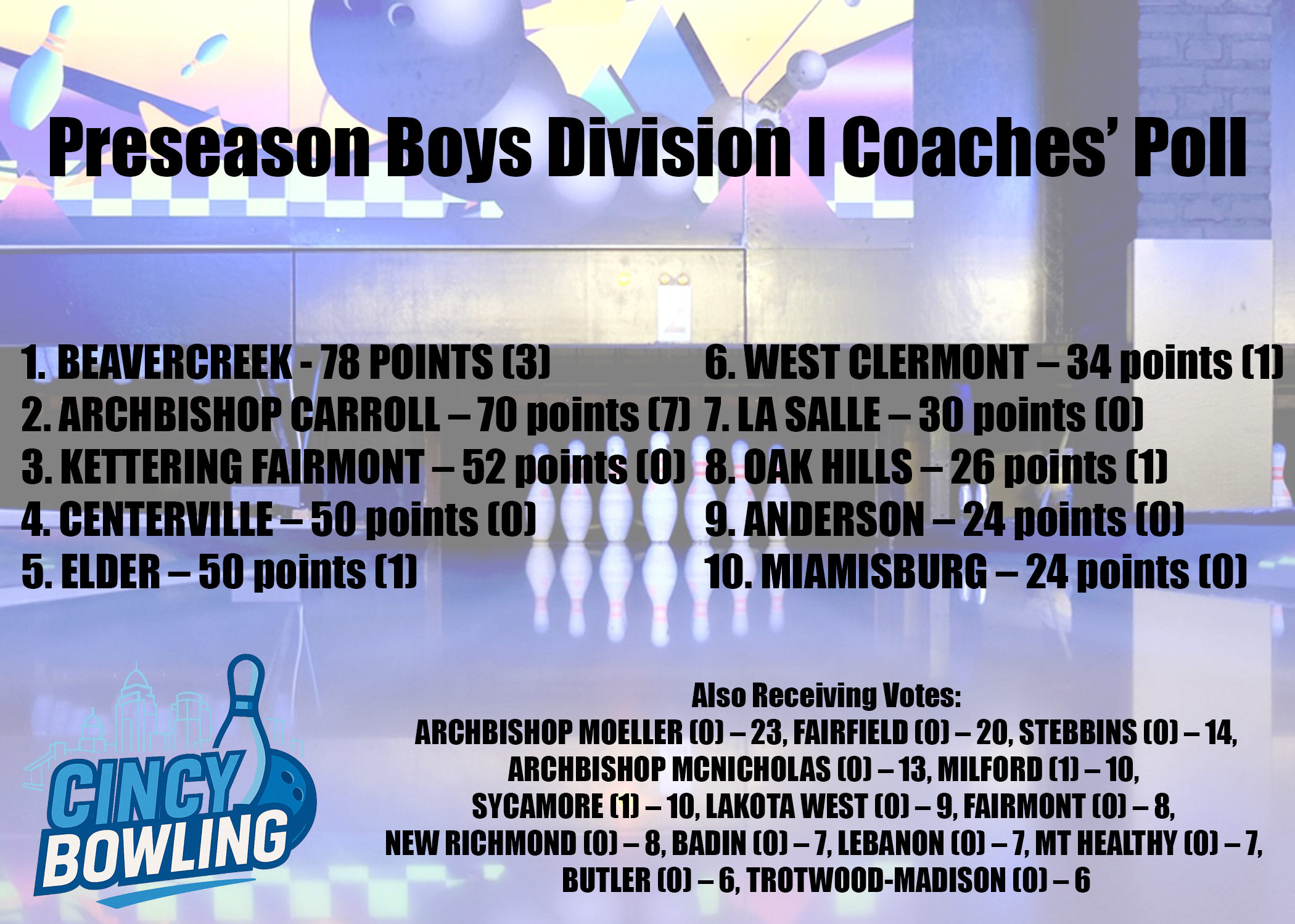 Cincinnati, OH — Cincy Bowling has released its official 2025–2026 Preseason Coaches’ Poll, marking the beginning of high school bowling in the Cincinnati–Dayton region. Teams may officially begin match play on Friday, November 14.